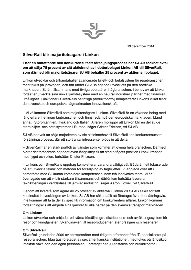 Efter en omfattande och konkurrensutsatt försäljningsprocess har SJ AB tecknat avtal om att sälja 75 procent av sitt aktieinnehav i dotterbolaget Linkon AB till SilverRail, som därmed blir majoritetsägare. SJ AB behåller 25 procent av aktierna i bolaget.