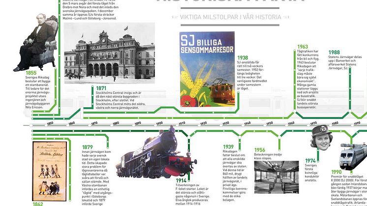 Svaren finner du på tidslinjen ovan där vi samlat de viktigaste milstolparna i SJs historia. Tidslinjen över SJs historia är bara en av de saker du möter här på SJ Nyhetsrum – vår nya, officiella samlingsplats för nyheter och information om företaget. Tidslinjen kan du även ladda ned infrån Foto & film-arkivet här intill eller här: SJs_tidslinje.