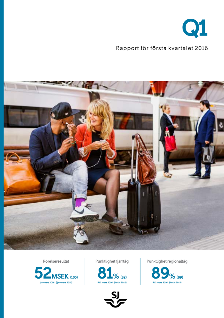 SJs rörelseresultat för det första kvartalet 2016 uppgick till 52 MSEK (105) och nettoomsättningen till 2 184 MSEK (2 223).
