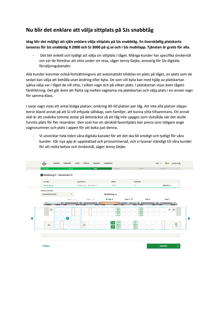 - Det blir enkelt och tydligt att välja sin sittplats i tåget. Många kunder har specifika önskemål om var de föredrar att sitta under sin resa, säger Jenny Gejke, ansvarig för SJs digitala försäljningskanaler.