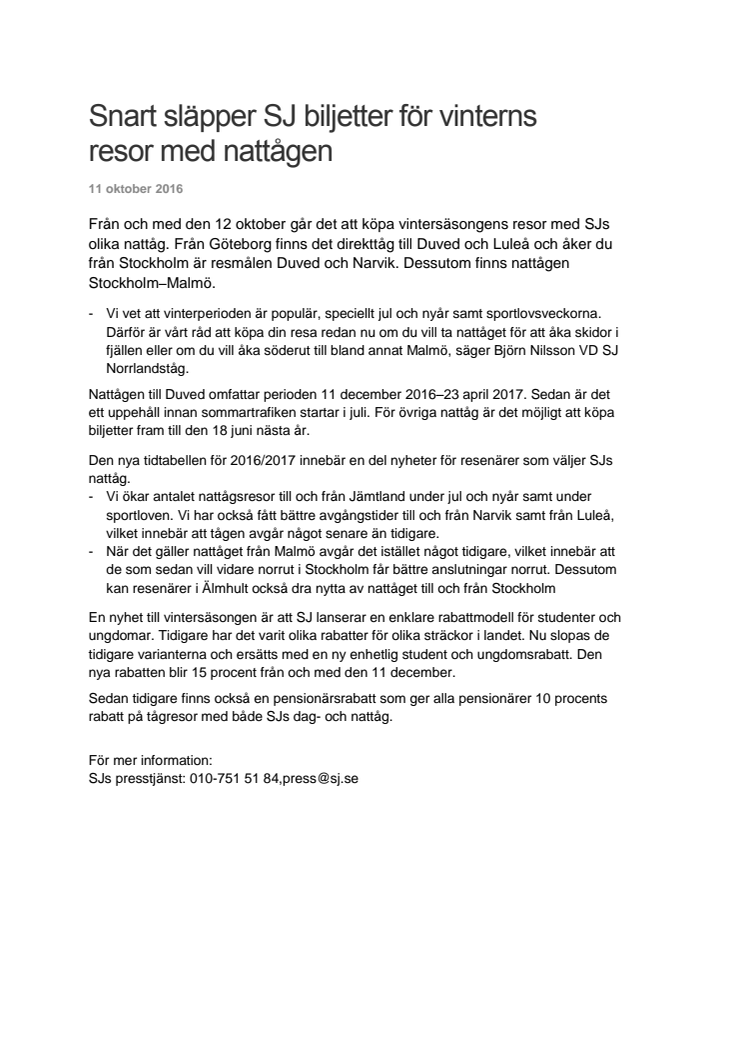 - Vi vet att vinterperioden är populär, speciellt jul och nyår samt sportlovsveckorna. Därför är vårt råd att köpa din resa redan nu om du vill ta nattåget för att åka skidor i fjällen eller om du vill åka söderut till bland annat Malmö, säger Björn Nilsson VD SJ Norrlandståg.
